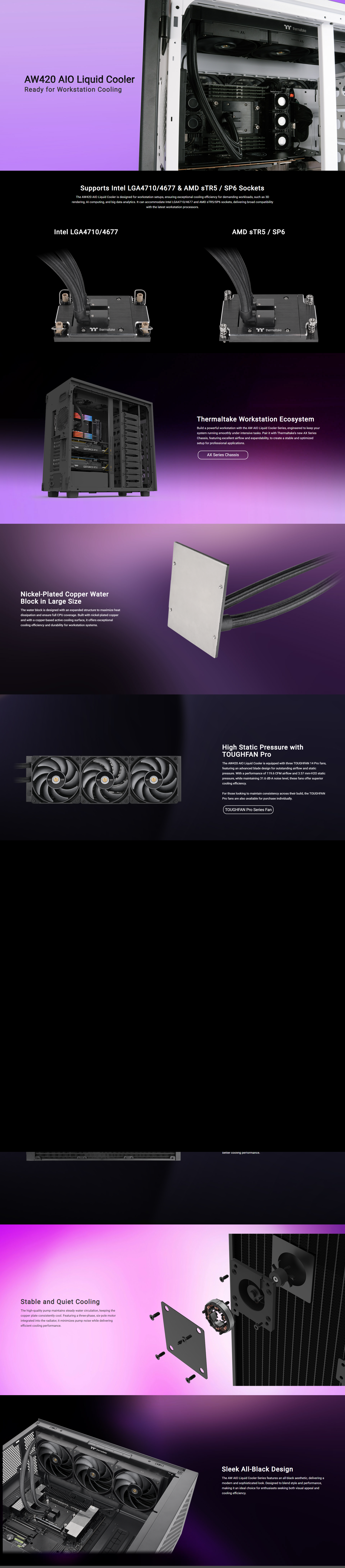 The AW420 AIO Liquid Cooler provides premium cooling performance for workstation configurations, supporting Intel LGA4710/4677 and AMD sTR5/SP6 sockets. It features a nickel-plated copper water block for excellent heat dissipation and three TOUGHFAN 14 Pro fans with high static pressure. It is an ideal cooling solution for intensive tasks like 3D rendering and AI computing. Its all-black aesthetic design combines performance and style for the ultimate workstation experience.