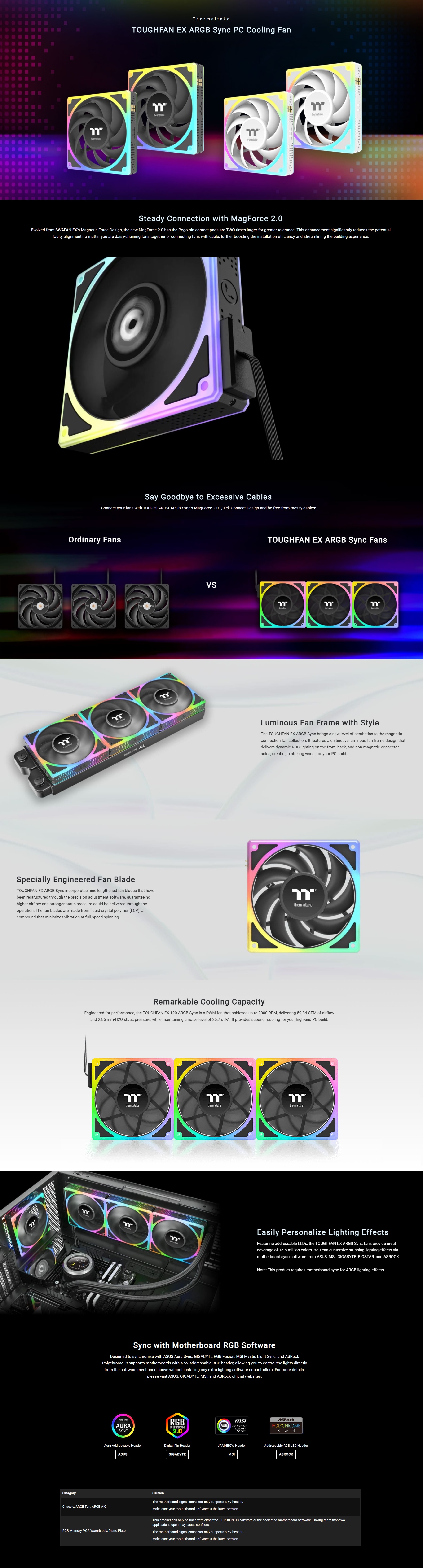 The TOUGHFAN EX 120 ARGB Sync features the MagForce 2.0, enabling better and quicker magnetic connections among fans. Its luminous fan frame design enhances aesthetics with unique RGB lighting that is fully customizable via motherboard sync software. Inheriting the LCP fan blade design from the TOUGHFAN series, it delivers powerful cooling performance for high-demand systems.