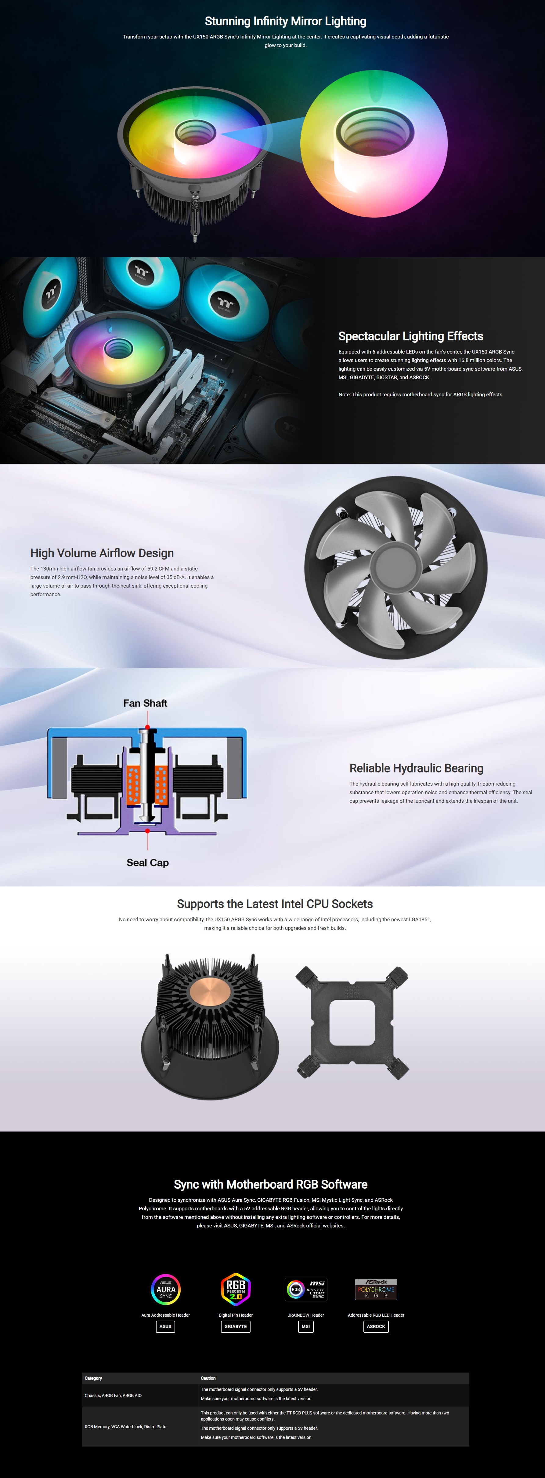 The UX150 ARGB Sync features a 130mm high-airflow fan that delivers up to 130W of cooling power. Designed with an infinity mirror style lighting effect at the center and customizable lighting effects controlled via motherboard sync software, it enhances the overall aesthetics.