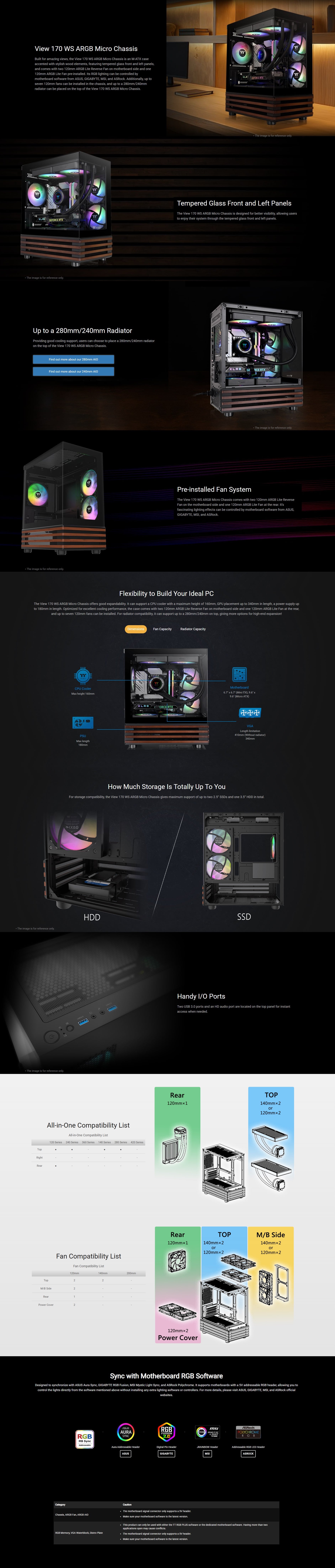 Built for amazing views, the View 170 WS ARGB Micro Chassis is an M-ATX case accented with stylish wood elements, tempered glass front and left panels, and comes with two 120mm ARGB Lite Reverse Fan on motherboard side and one 120mm ARGB Lite Fan at the rear.