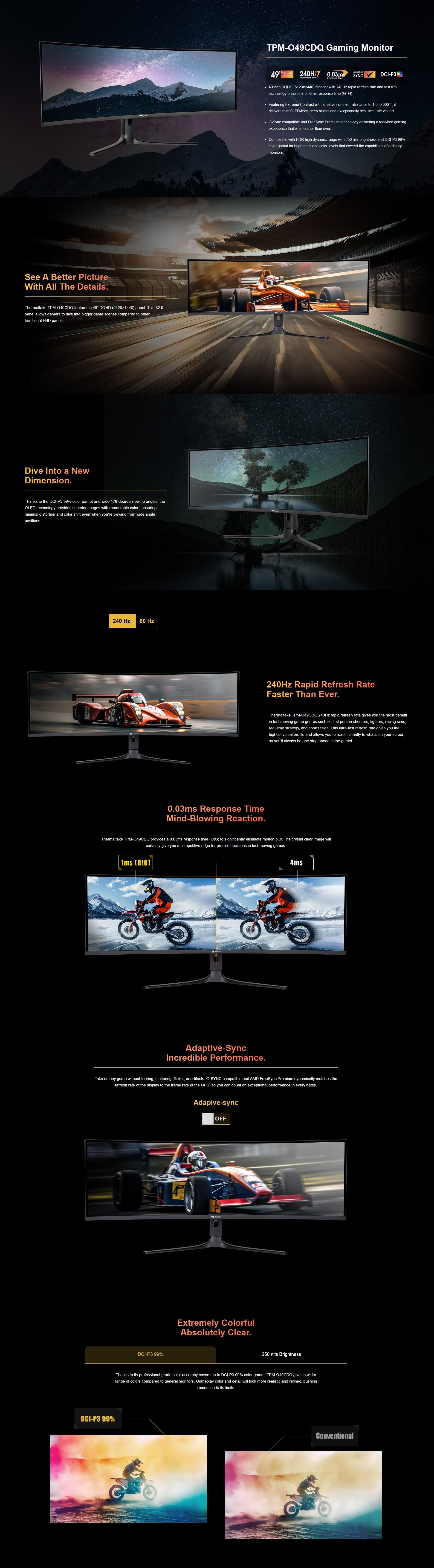 Featuring Extreme Contrast with a native contrast ratio close to 1,000,000:1, it delivers true OLED-level deep blacks and exceptionally rich, accurate visuals, bringing every frame to life with remarkable depth and realism. Equipped with a 240 Hz rapid refresh rate and Fast IPS technology enabling an ultra-fast 0.03 ms (GTG) response time, the TPM-O49CDQ ensures fluid, precise motion clarity even during the most intense action.