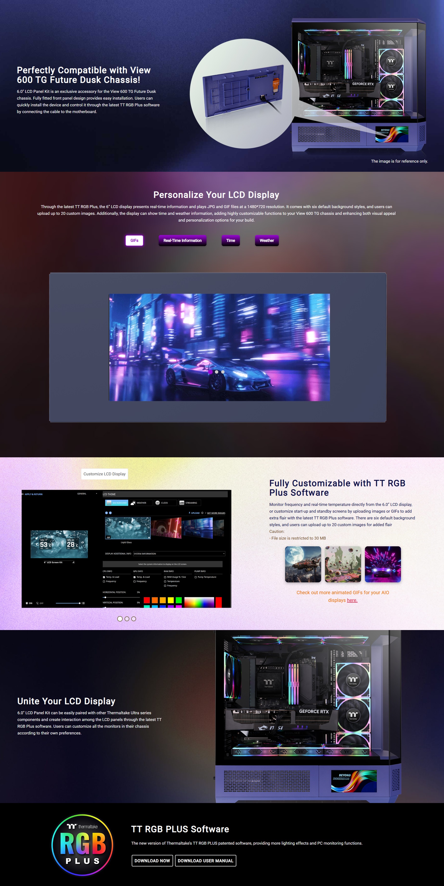 6.0" LCD Panel Kit is an exclusive expansion accessory for the View 600 TG Future Dusk chassis. With its 6.0'' LCD display, users can use the latest TT RGB Plus software to gain full control of performance monitoring and personalized effects. Additionally, the LCD Panel Kit can be paired with other Thermaltake Ultra series products, providing the best LCD visual experience.
