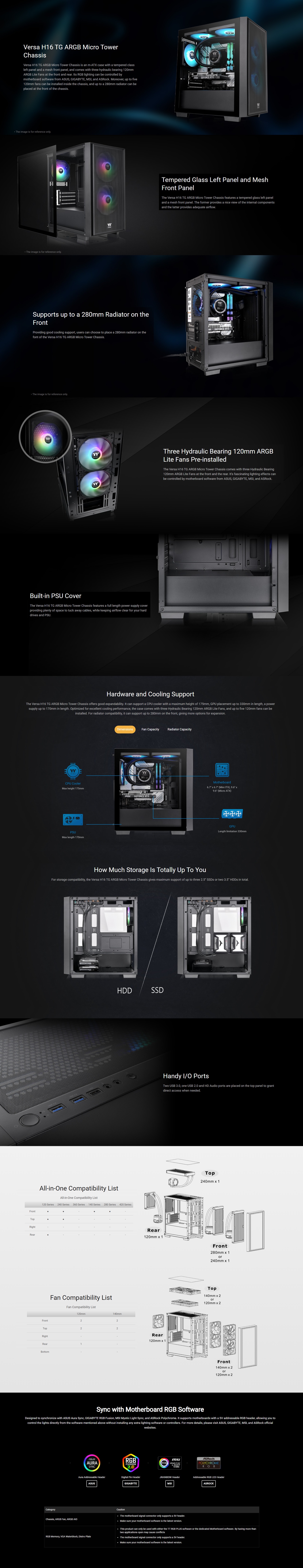 Versa H16 TG ARGB Micro Tower Chassis is an m-ATX case with a tempered class left panel and a mesh front panel, and comes with three hydraulic bearing 120mm ARGB Lite Fans at the front and the rear.