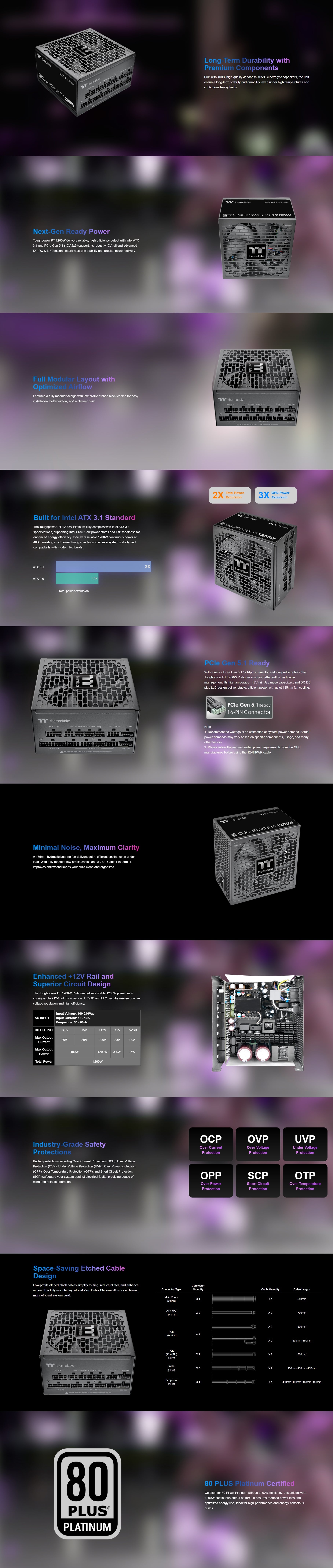 The Toughpower PT 1200W Platinum is ATX 3.1 compatible, 80 PLUS Platinum certified, and supports native PCIe Gen 5.1 (12+4pin) for next-gen GPU power. Delivers 1200W continuous output at 40°C