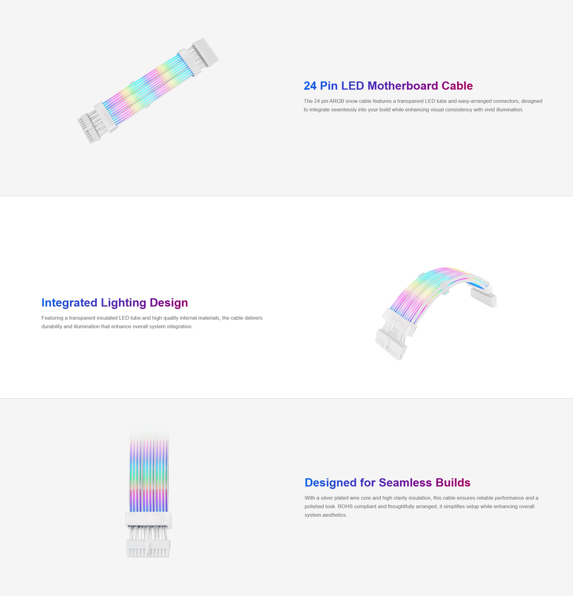 The Tt Mod 24 pin ARGB Snow Cable features a transparent LED tube, delivering a stylish illumination that seamlessly complements any PC chassis interior.