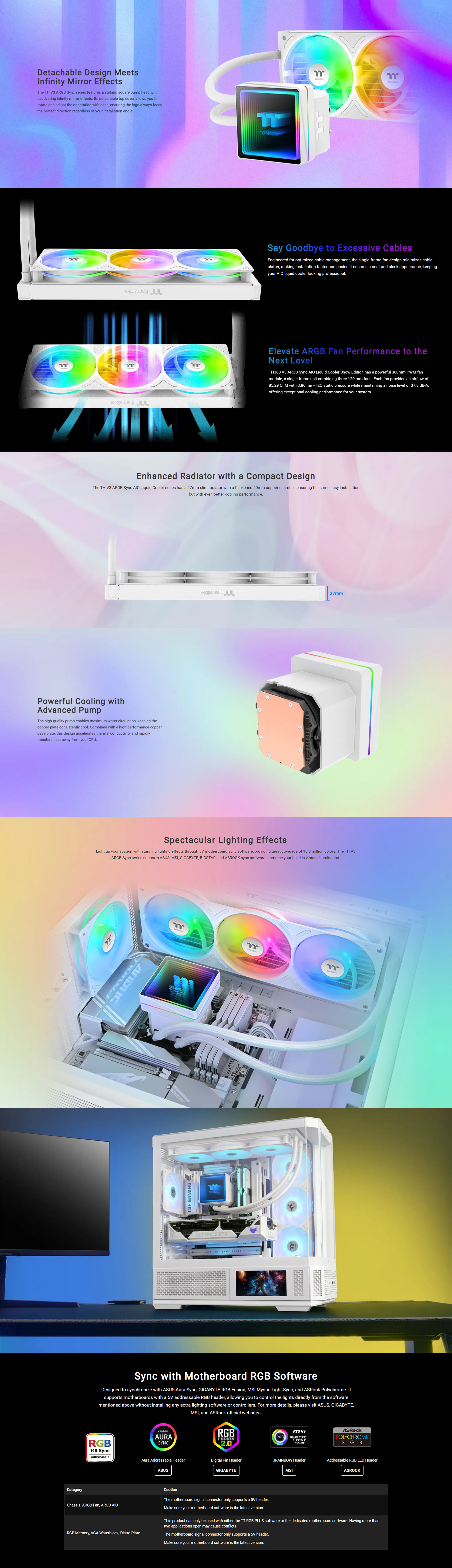 The TH360 V3 ARGB Sync Snow Edition features a stylish square pump head with infinity mirror effects, along with a detachable top cover for orientation adjustment to match your build. The single-frame fan design achieves superior cable management for easy installation. Paired with high-performance ARGB fans reaching up to 2500 RPM, it delivers exceptional cooling performance.